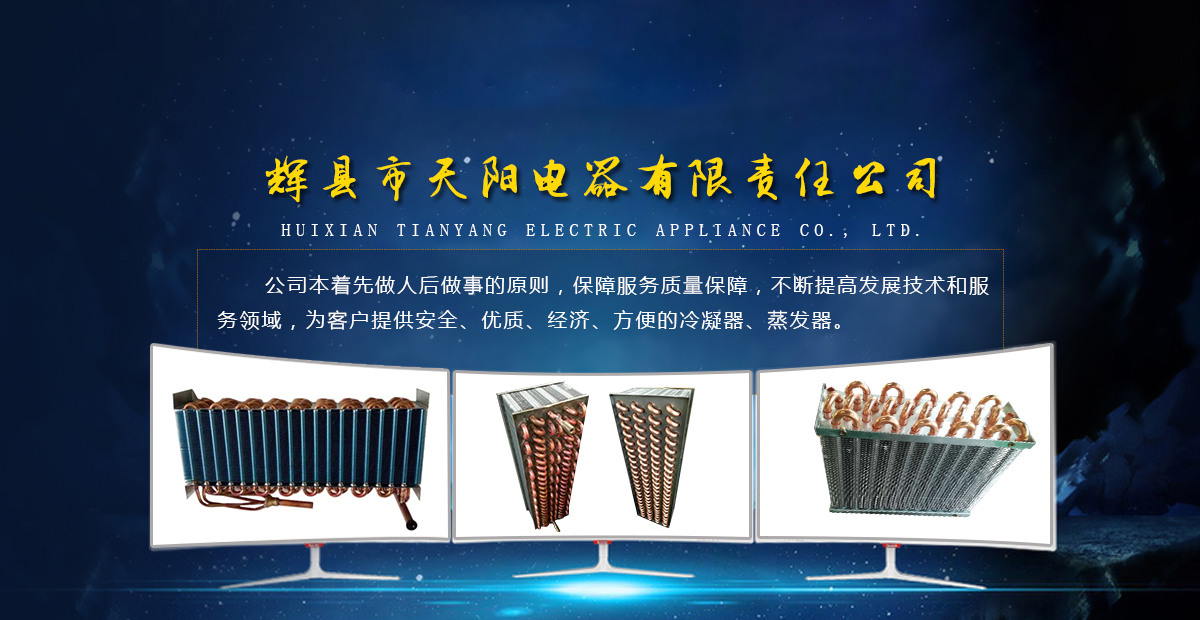 輝縣天陽(yáng)電器有限責(zé)任公司位于肥沃的中原河南省輝縣市學(xué)院路中段工業(yè)集聚區(qū)興業(yè)園3號(hào)廠房,以制冷設(shè)備用冷凝器,蒸發(fā)器,熱交換器為主。主要材料為銅管鋁翅片,銅管銅翅片,鋁管鋁翅片。廣泛應(yīng)用于冰箱冰柜,制冷設(shè)備,暖通設(shè)備,空調(diào),自動(dòng)售貨機(jī),冷干機(jī),超市立風(fēng)柜,冷藏車,烘干機(jī)等產(chǎn)品領(lǐng)域。  公司自1998年成立以來(lái),始終堅(jiān)持:“科技造就產(chǎn)業(yè)、質(zhì)量成就信譽(yù)、誠(chéng)信鑄就輝煌”的質(zhì)量方針,從產(chǎn)品拓展上堅(jiān)持“人無(wú)我有,人有我優(yōu),人優(yōu)我特的”經(jīng)營(yíng)理念,25年來(lái),從1998年開(kāi)始供應(yīng)河南冰熊集團(tuán)下屬的冷柜廠,制冰機(jī)廠各種冷凝器;2003年之后,原冰熊集團(tuán)的精英志士開(kāi)始在全國(guó)各地發(fā)展,所到之處依托我公司供貨,以致于多家目前已具行業(yè)中佼佼者的公司,從而建立了如凱雪公司,兆邦公司、凌云公司、海寶公司、正雪公司、上海忠云、山東德萊維等幾十余家公司在草創(chuàng)時(shí)期的啟蒙供貨商,友好共贏長(zhǎng)達(dá)十余年,成為我國(guó)制冷行業(yè)的供應(yīng)商。以致在2015年初雙匯集團(tuán)面向社會(huì)的招標(biāo)書中指名要我公司冷凝器、蒸發(fā)器指定產(chǎn)品供應(yīng)商
